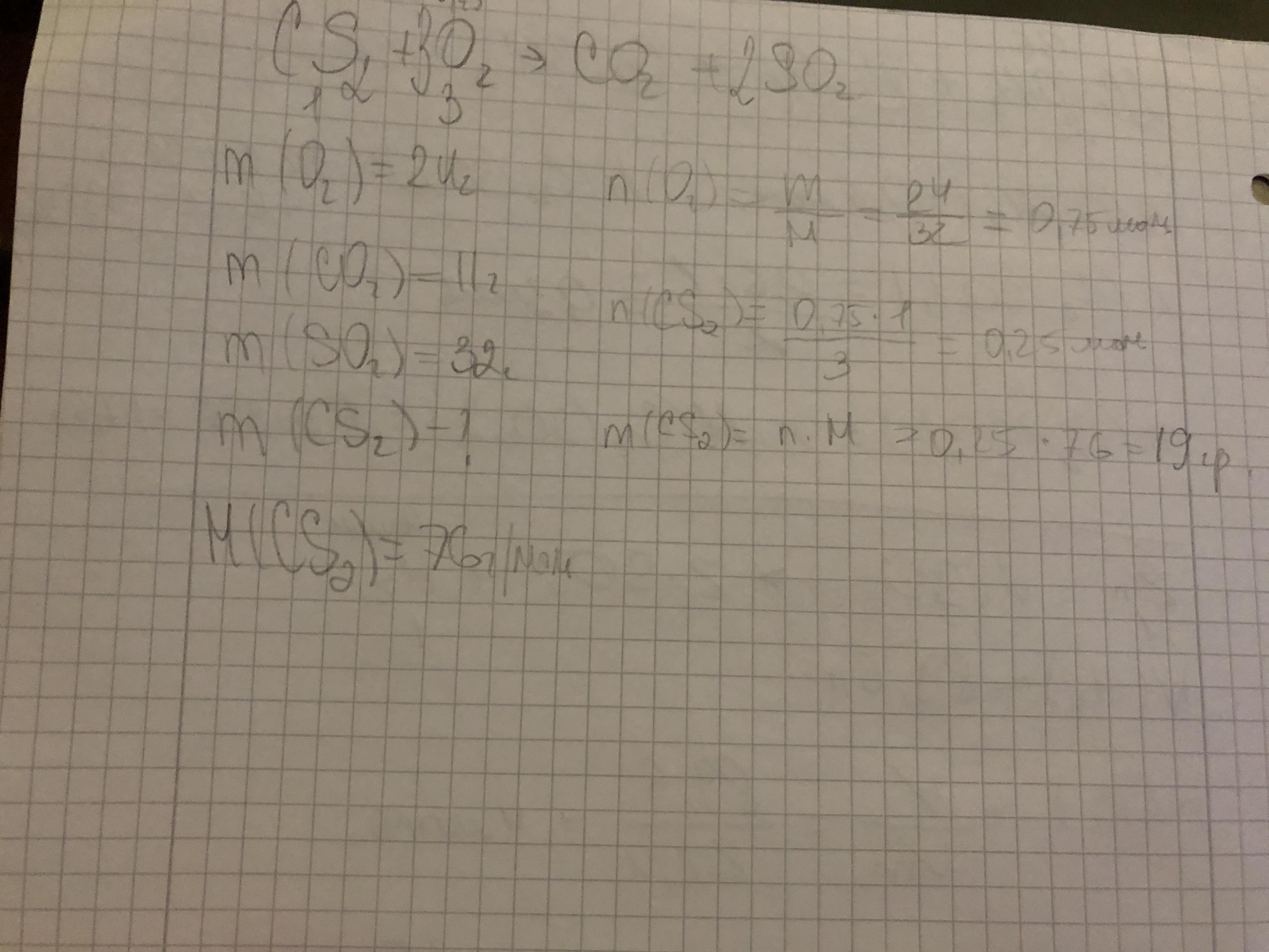 У результаті згоряння сірковуглецю CS2 витрачено кисень масою 24 г і утворилися карбон(IV) оксид масою 11 г і сульфур(IV) оксид масою 32 г. Складіть рівняння цієї реакції та обчисліть масу сірковуглецю, що згорів.