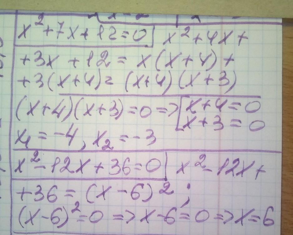 способом розкладання на множники розв'яжітт рівняння Х2+7Х+12=0 та Х2-12Х+36=0