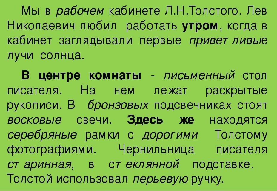 Опишите кабинет Л. Н. Толстого. Во вступление наптшите несколько слов о нём самом. В основной части именно опишете сам кабинет, что там находится, что за картины, где какие предметы и т.д.(откуда эти предметы у него и какие произведения он там написал можно не писать). Ну и вывод.