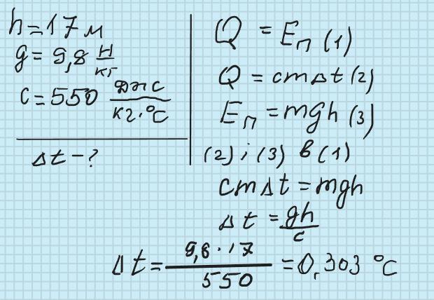 на скільки градусів нагріется деталь з чавуна , якщо вона впадає з висоти 17м. на землю. вважажмо , що вся квнетична енергія чавуна переходить у внутрішню енергію . питлма теплоємнвсть чавуна рівна 550дж/(кг к) g=9,8h/кг