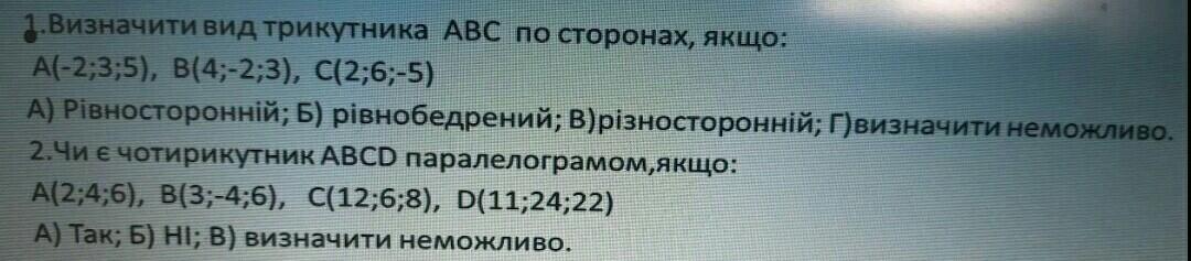 2. пусть О(х, у, z)- середина диагонали АС, К(х₁, у₁, z₁)- середина диагонали ВД, если докажем, что эти точки совпадают. значит. четырехугольник АВСД - параллелограмм, если не совпадают. то не параллелограмм.
