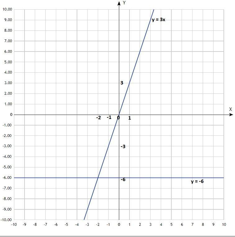 Побудуйте в одній системі координат графіки функцій: y=3x та y= -6 і знайдіть координати точки їх перетину.
