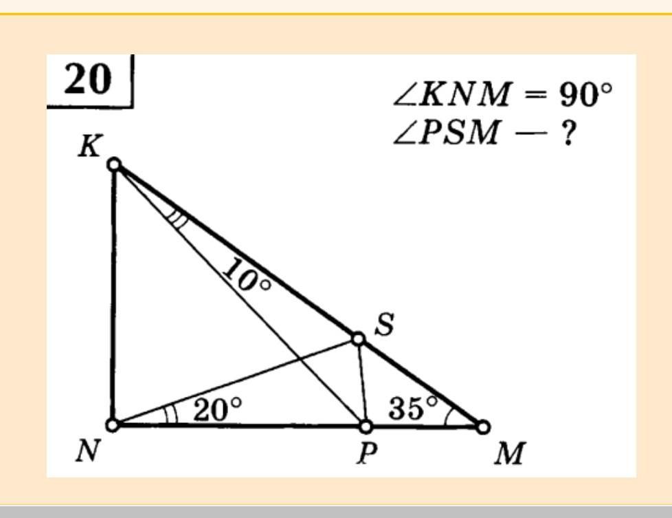 С другой стороны, в ∆ PNK угол РNK=∠SNK-∠SNP=90°-20°=70°. Отсюда ∠КРN=180°-70°-55°=55°, ⇒ ∆ PNK –равнобедренный. PN=NK. Но NK=NS ⇒ NS=NP и ∆ SNP равнобедренный. ∠NSP=∠NPS =(180°-20°):2=80°