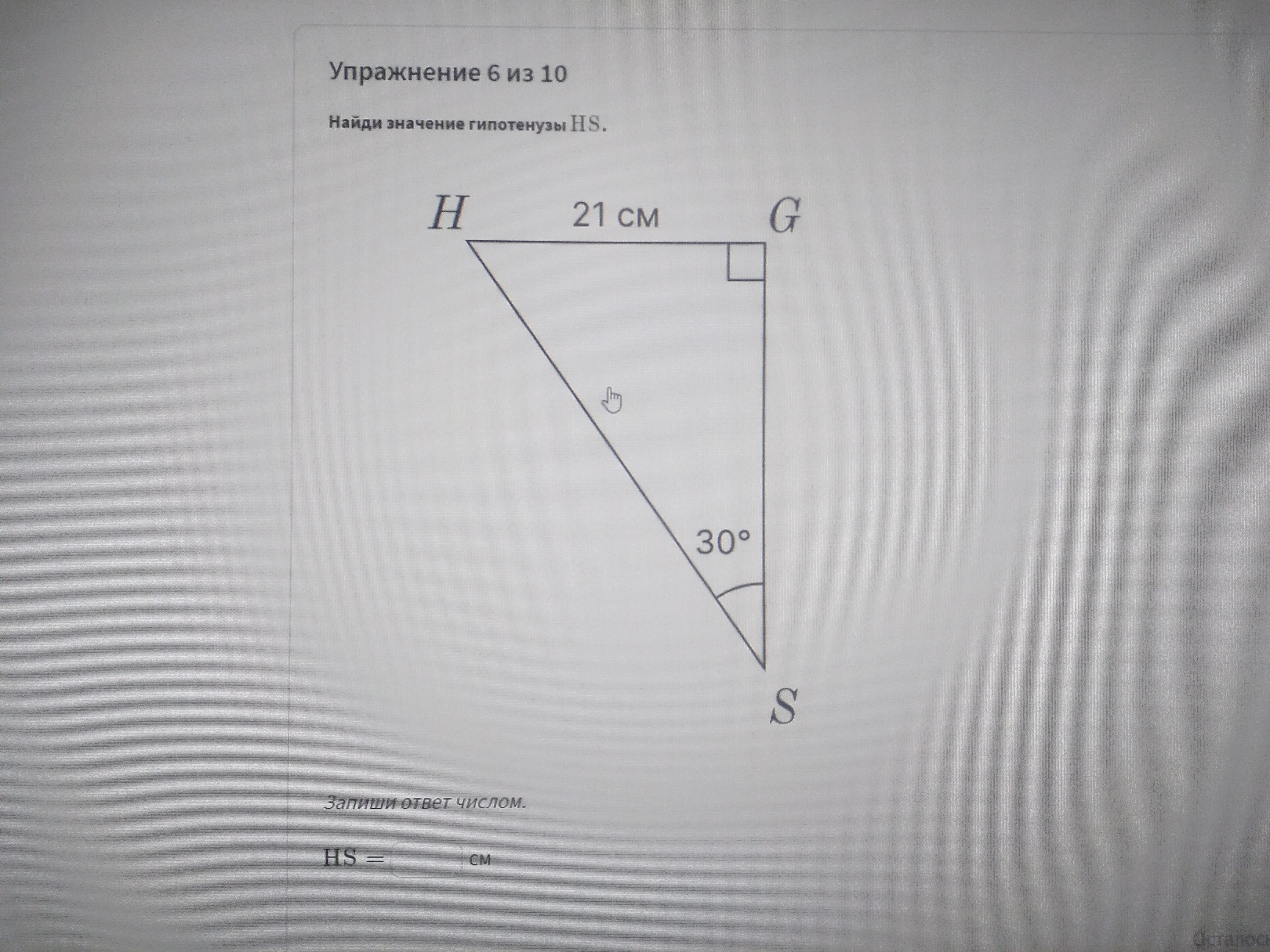 так как угол S=30 градусов, а угол G=90 градусов треугольник HGS-прямоугольный