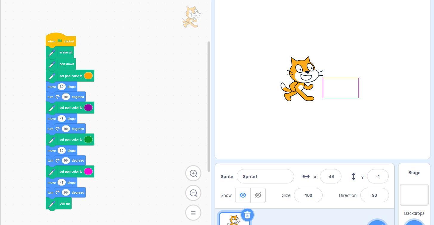 Д поможіть будь ласка це зробити в скреч онлайн має вийти прямокутник з сторонами 80 та 45 кроків мені потрібно 2 скріна кота і що він намалював і команд ще змінити фон і виконавця будь ласка допоможіть