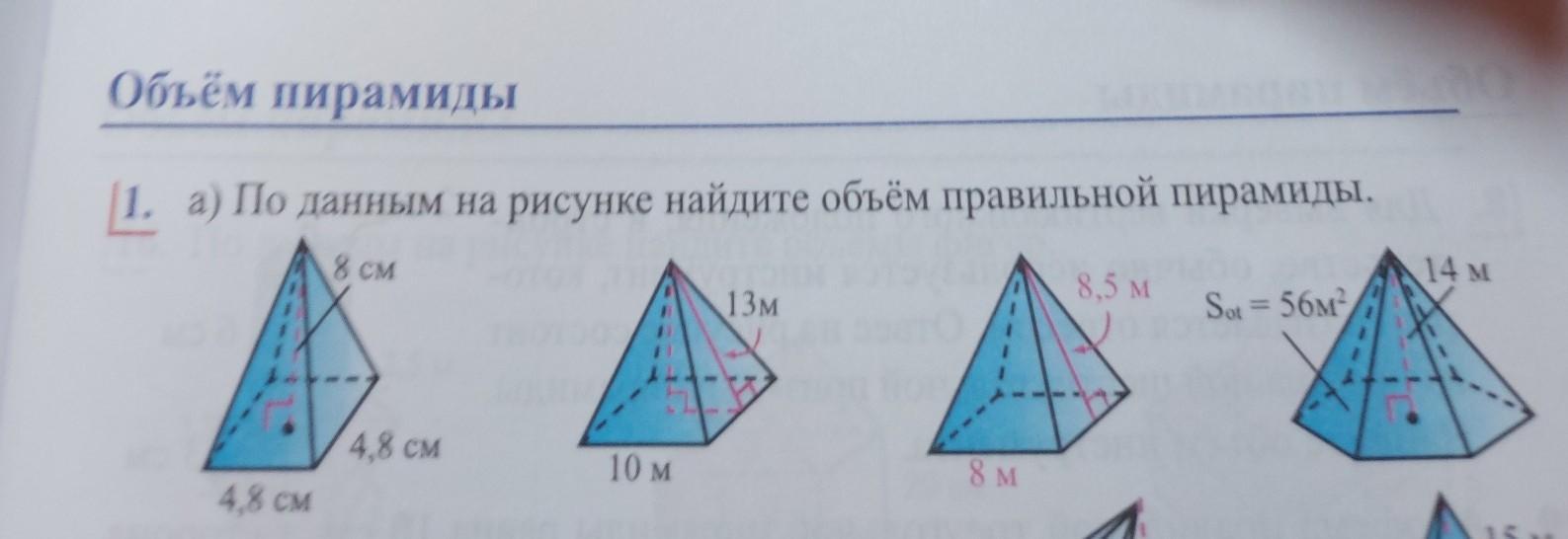 8²=64/м²/, чтобы найти высоту пирамиды, необходимую для вычисления объема, надо рассмотреть прямоугольный треугольник, на рис. есть гипотенуза этого треугольника - это апофема, она равна 8.5 м, если провести диагонали в основании и из точки пересечения провести перпендикуляр к правой стороне квадрата, он равен половине стороны квадрата, т.е. 4; то основание апофемы и основания этого перпендикуляра совпадут. и высоту можем найти по теореме Пифагора с.о. √(8.5²-4²)=√(72.25-16)=√56.25=7.5/м/, значит, объем равен 7.5*64/3=2.5*64=160/ь³/