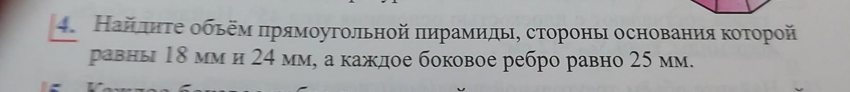 Ответ:Объем пирамиды V=1/3 *Sосн *h Sосн = 18*24=432 Высота пирамиды попадает в точку пересечения диагоналей прямоугольника в основании (так как длины рёбер равны) Чтобы найти h, найдем длину диагонали d. d=sqrt(24*24-18*18)=sqrt(900)=30 h=sqrt(25*25-30/2*30/2)=sqrt(400)=20.