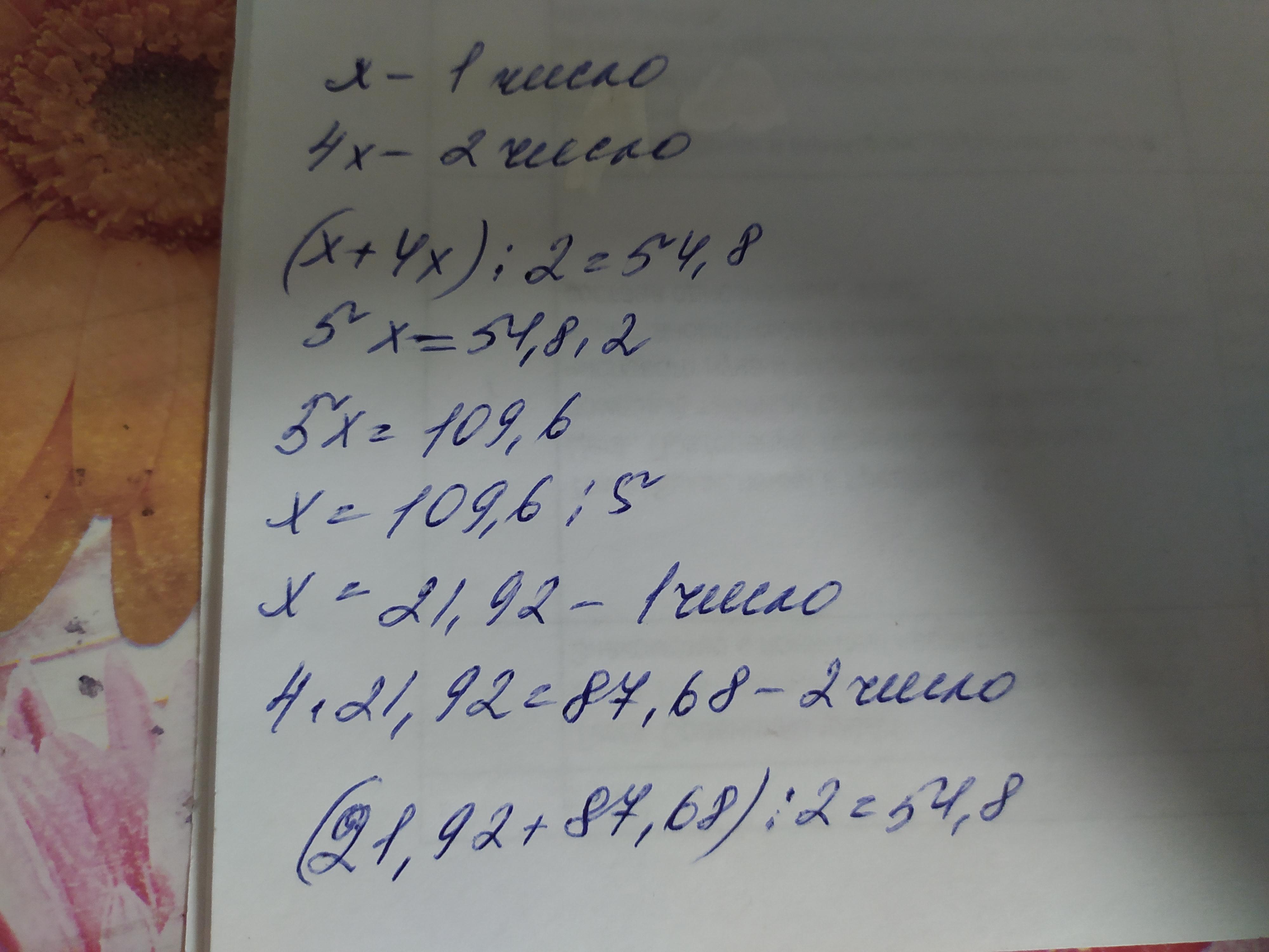 Завдання (виконай у робочому зошиті) 1. Виконай завдання. Одне із чисел у 4 рази більше за інше, а іх середнє арифметичне дорівнює 54,8. Знайди ці числа. Доораи адачу.