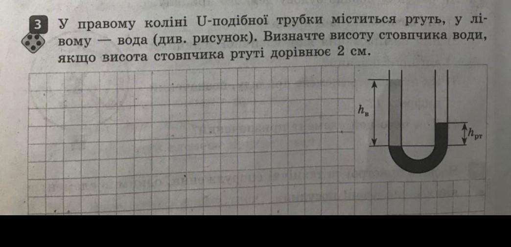 В правому коліні U - подібної трубки міститься ртуть, а в лівому - вода (рис.1). Визначте висоту стовпчика води, якщо висота стовпчика ртуті дорівнює 2 см.