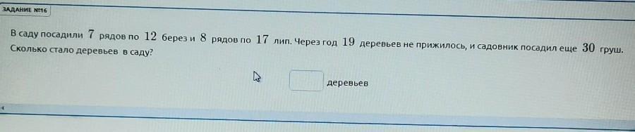 12*7=84/березы/ и 17*8=136/лип/, всего 84+136=220/деревьев/, из них 19 не принялось, но садовник посадил еще 30 груш значит, всего в саду стало 220-19+30=231/дерево/