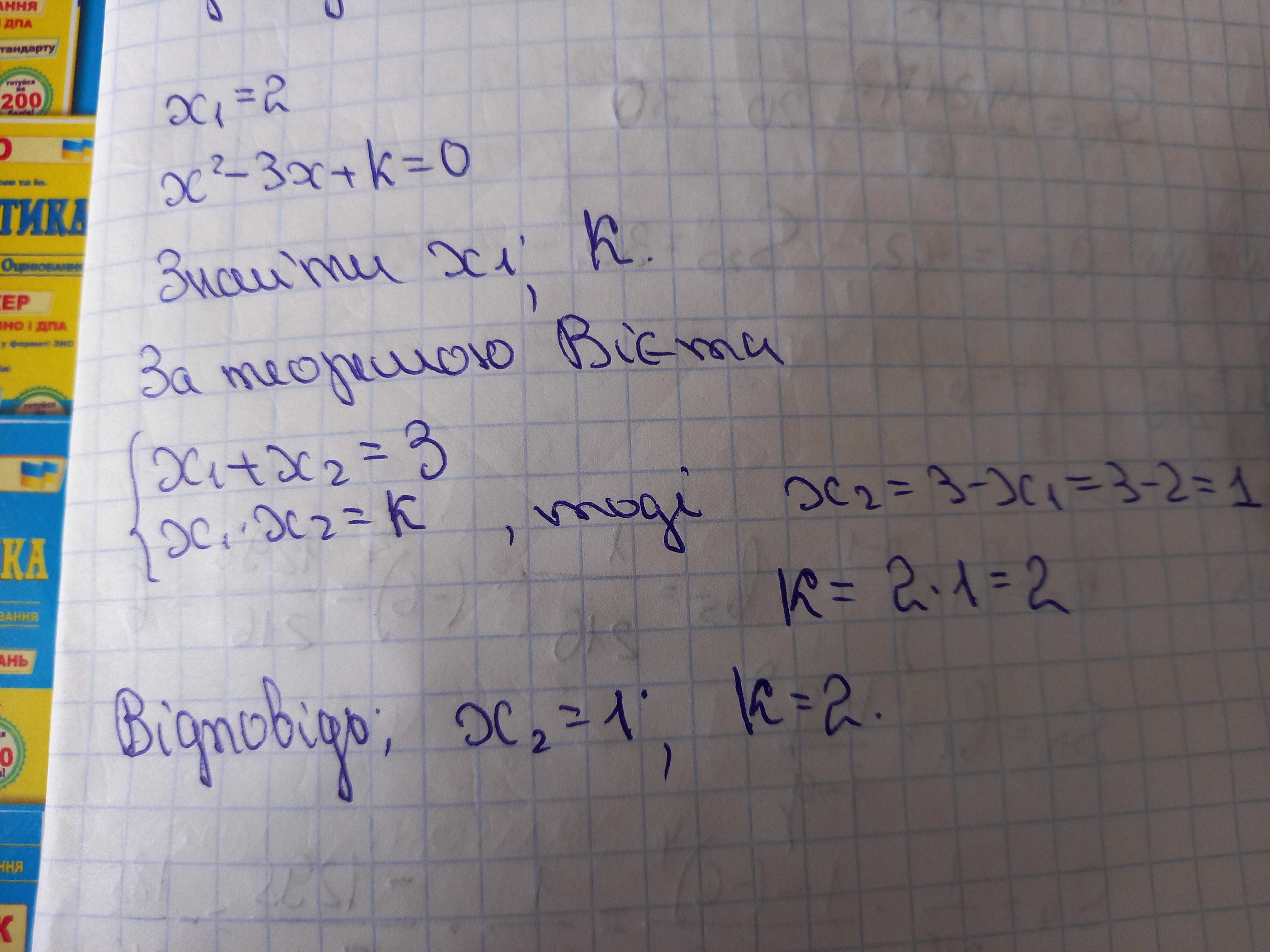 один із коренів квадратного рівняння дорівнює 2 . знайдіть коефіцієнт k та другий корінь рівняння x²-3x+k=0 . ДОПОМОЖІТЬ БУДЬ ЛАСКА !!!!!