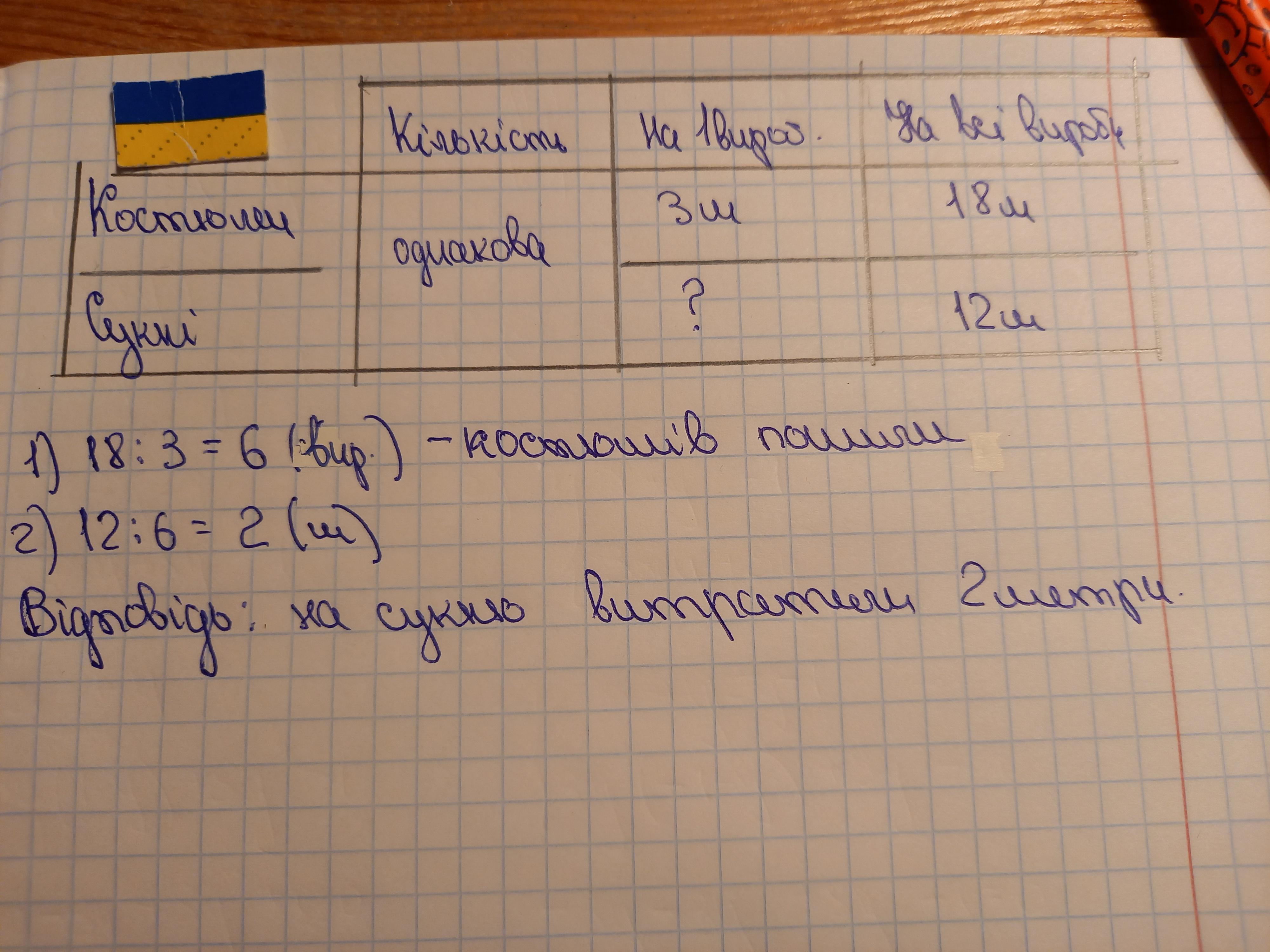 у майстерні пошили однакову кількість костюмів і суконь .на костюми витратили 18 м тканини на сукні 12 м.скільки метрів витратили на сукню , якщо на костюм іде по 3 м тканини.(треба у мову задачі дії знаю)