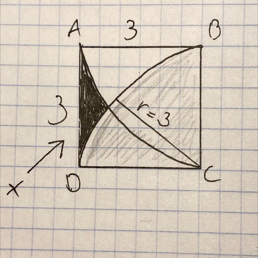В квадрате со сторой 3 проведены две дуги с радиусом 3 (см рисунок). Найдите площать закрашенной фигуры.