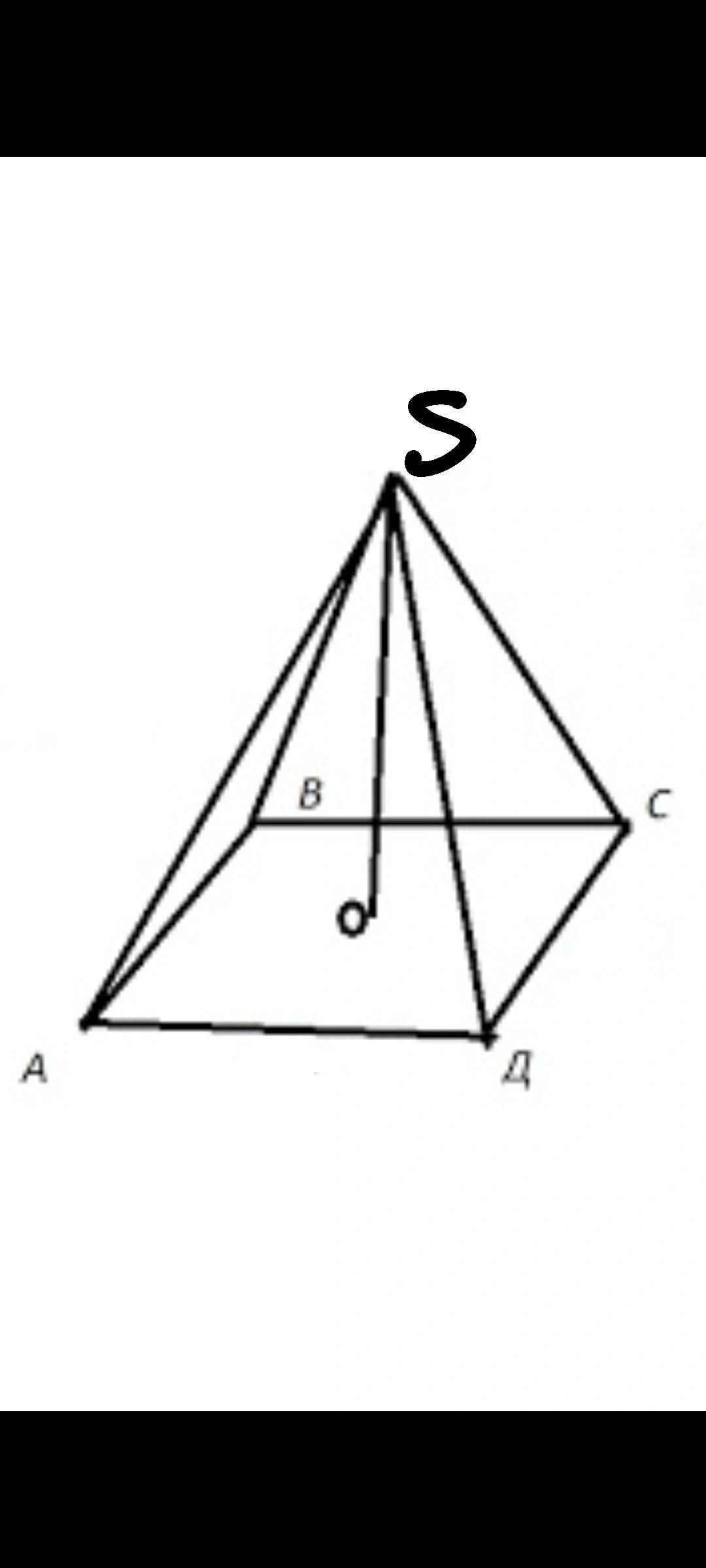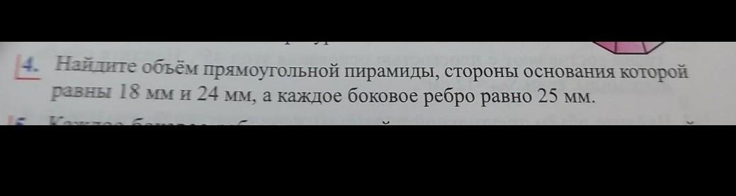 Найдем теперь высоту пирамиды из треугольника, в котором известна половина диагонали основания 15мм и боковое ребро =25 мм, высота равна h=√(25²-15²)=√(40*10)=20/мм/