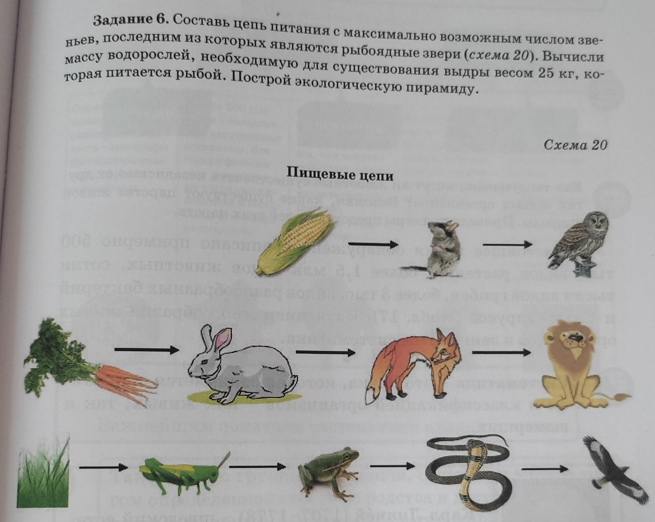 водоросли или водные высшие растения — растительноядные рыбы (карась) — рыбы хищные (щука) — рыбоядные хищники (медведь).