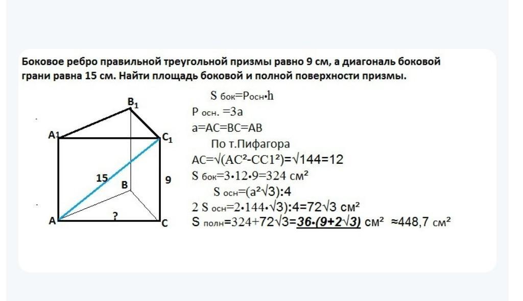 1.Боковое ребро правильной треугольной призмы = 9см, а диагональ боковой грани = 15см. Найдите площадь боковой поверхности и полную площадь поверхностей призмы.