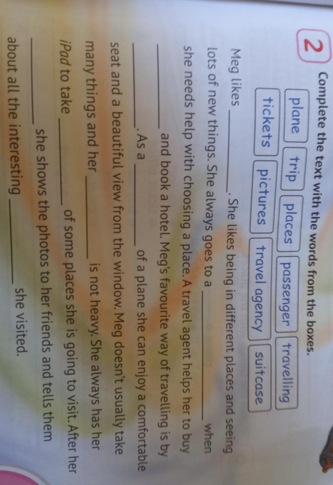 . travelling 2 .travel agency 3. tickets 4. plane 5. passenger 6. suitcase 7. pictures 8. trip 9. places