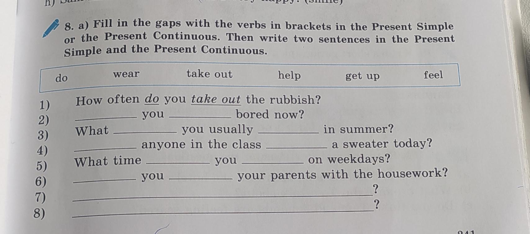 4. Is anyone in the class wearing a sweater...? 5. What time do you get up on weekdays? 6. Do you help your parents with housework?