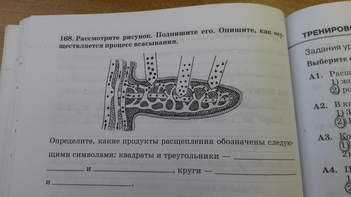 Квадраты и треугольники - углеводы ( в виде глюкозы) и белки ( в виде аминокислот). На картинке показано стрелочками их всасывание в капилляры кровеносной системы.