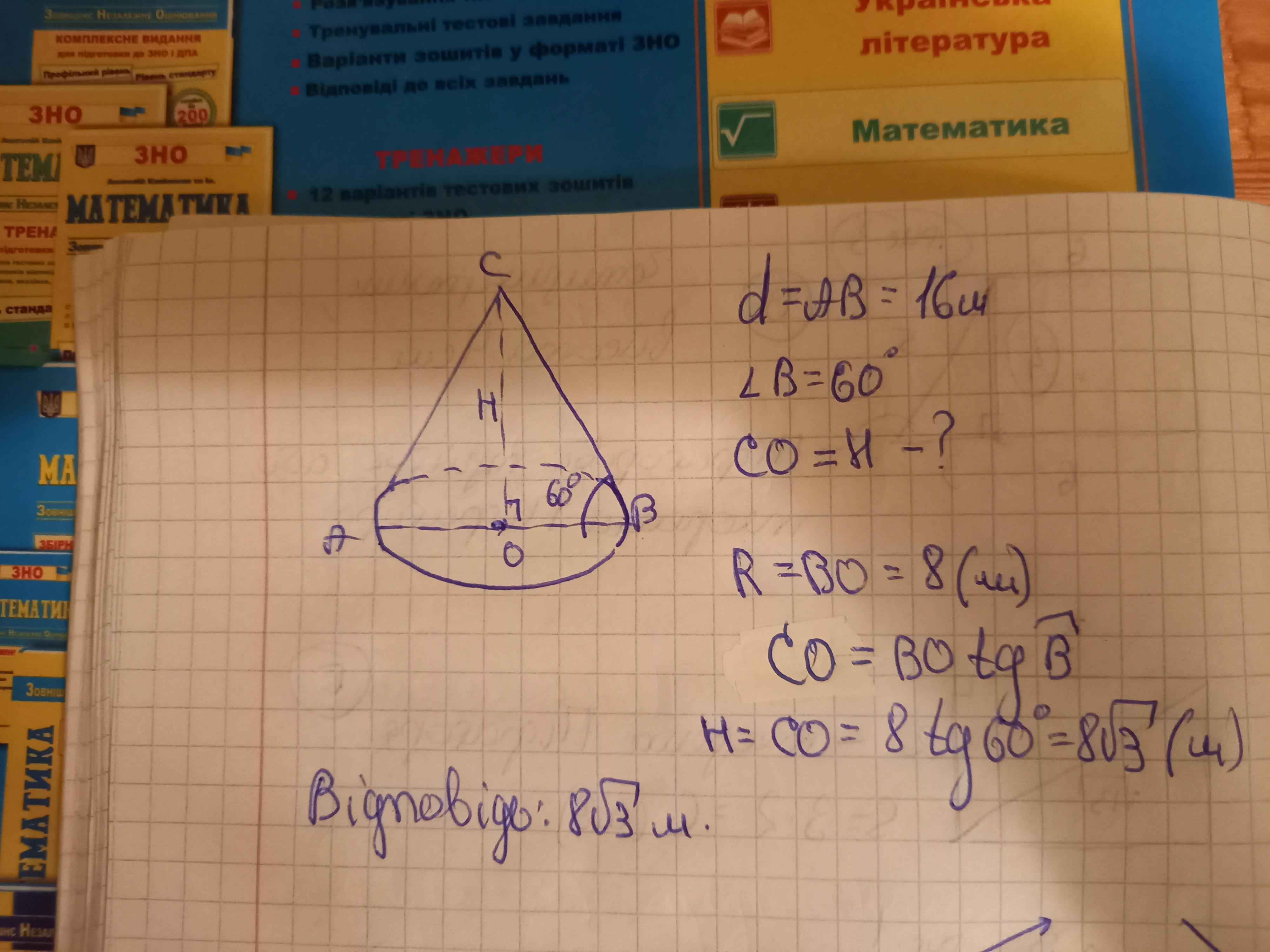 Діаметр основи конуса дорінює 16 м, а твірна нахилена до площини основи під кутом 60 градусов. Чому дорівнює висота конуса?