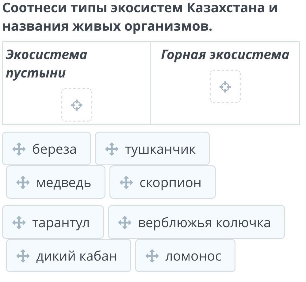 Многообразие живых организмов. Урок 1 Соотнеси типы экосистем Казахстана и названия живых организмов. Экосистема пустыни Горная экосистема