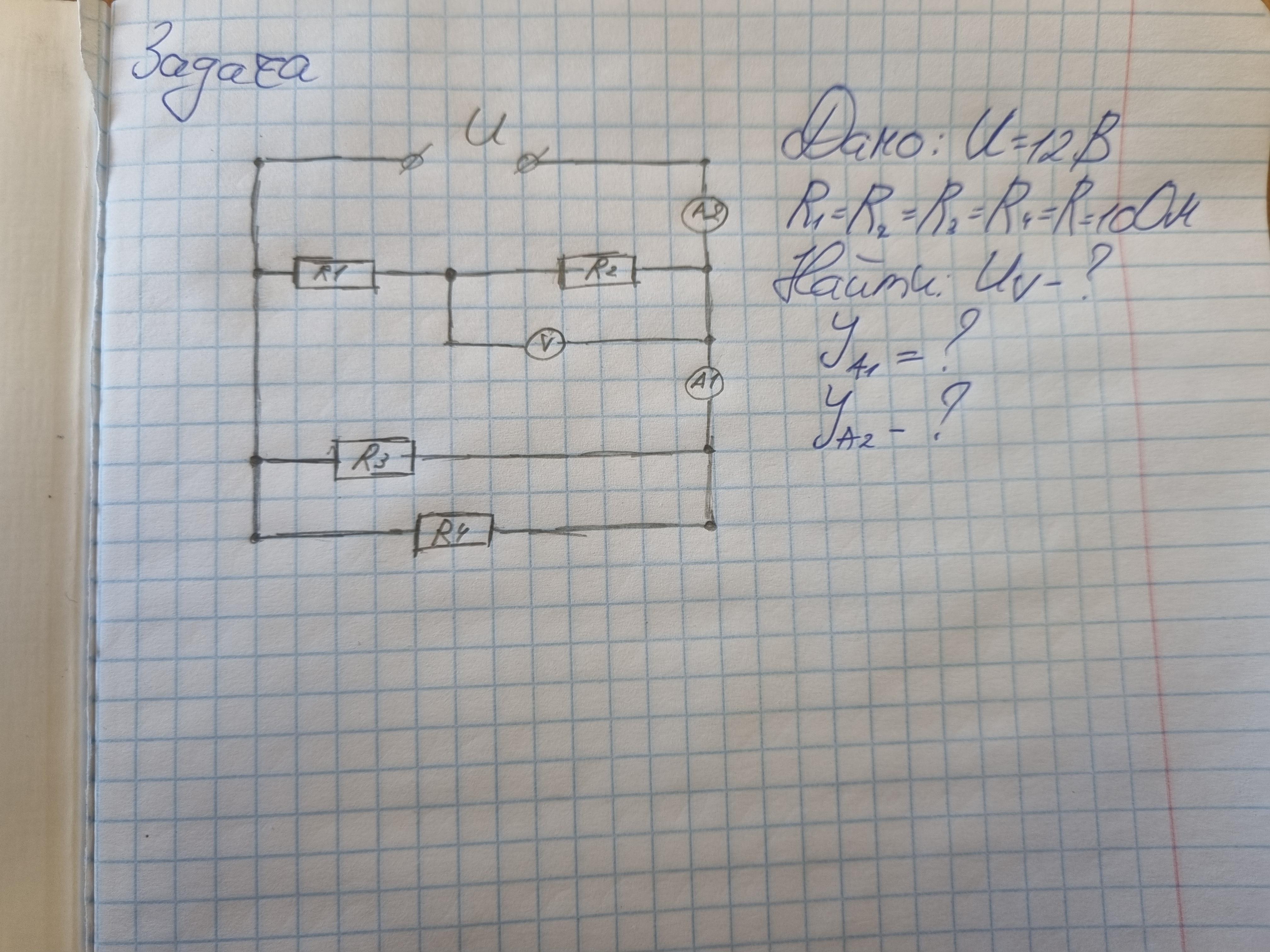 Напряжение на вольтметре 6 В. На первом ампериетре 0,6 A, а на втором 2,4 A.