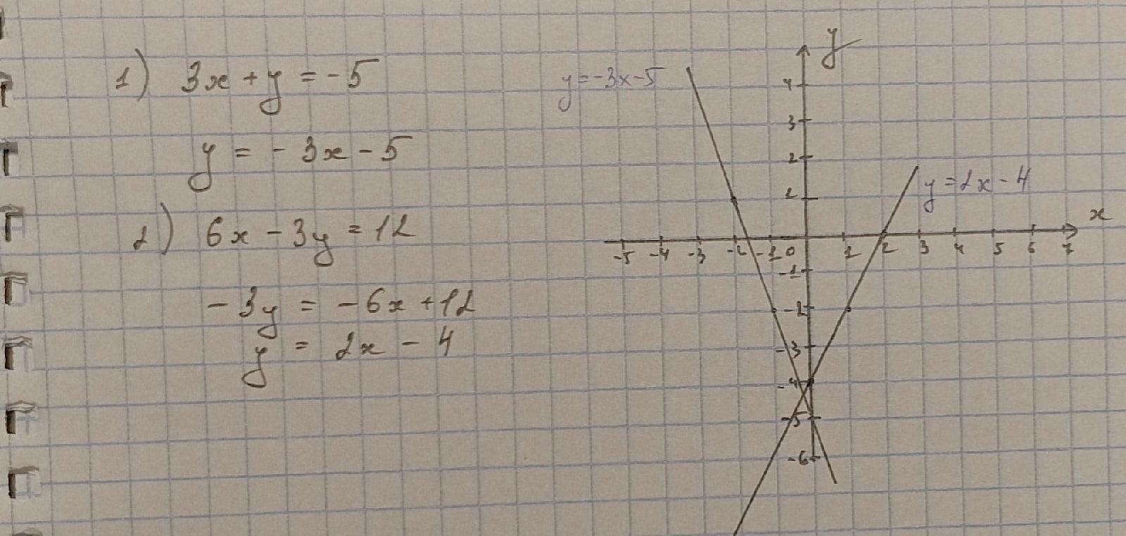 График функции у=-3х-5 соответствует линейному уравнению 3х+у=-5. График функции у=2х-4 соответствует линейному уравнению 6х-3у=12