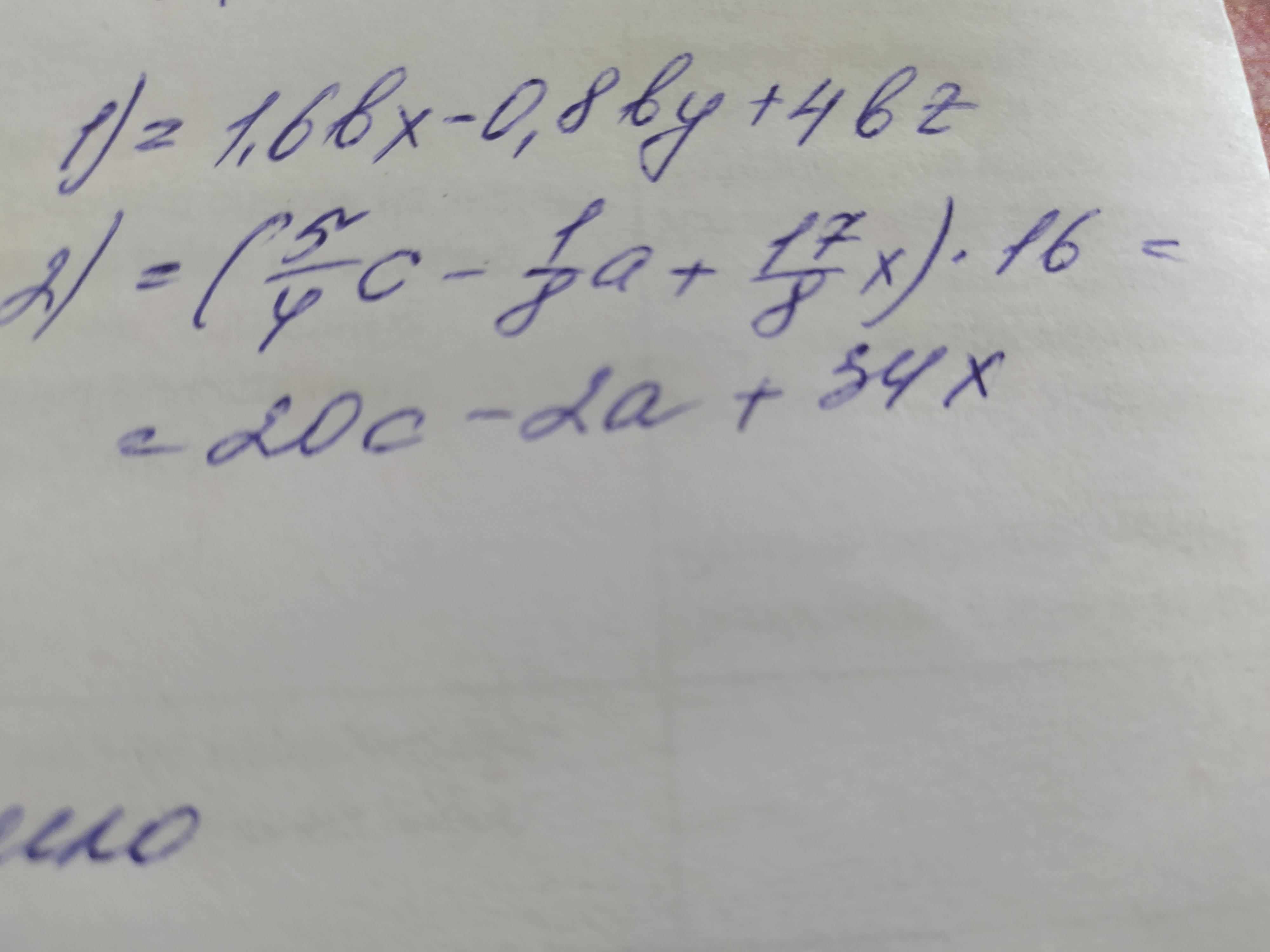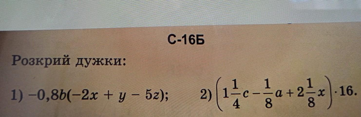 С. Розкрий дужки: 1) -0,8bc-2х + у — 52); (1 1/4с -1/8а+2 1/8x)•16.​