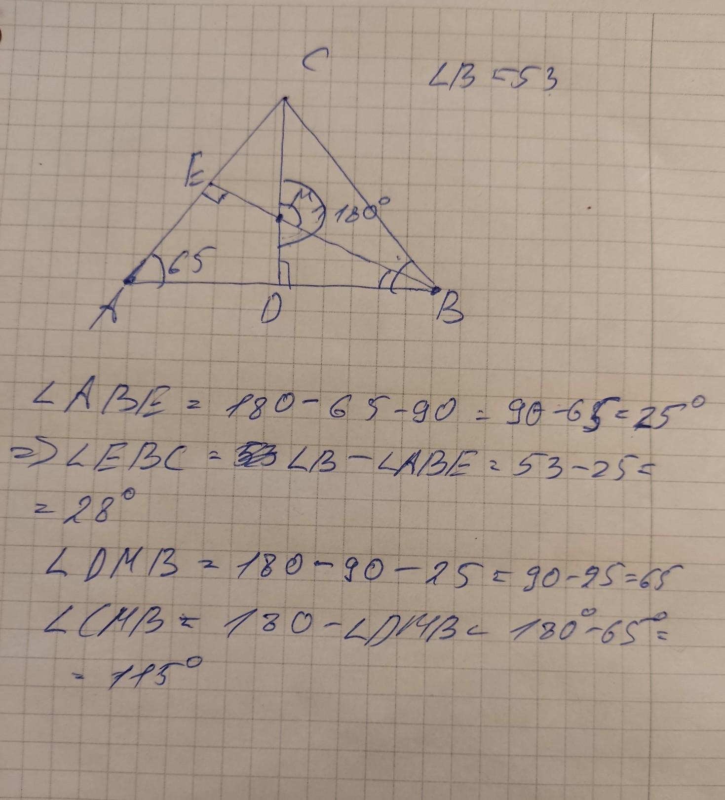 Треугольник ACB угол A=65градусов; угол B=53градуса; CDвысота