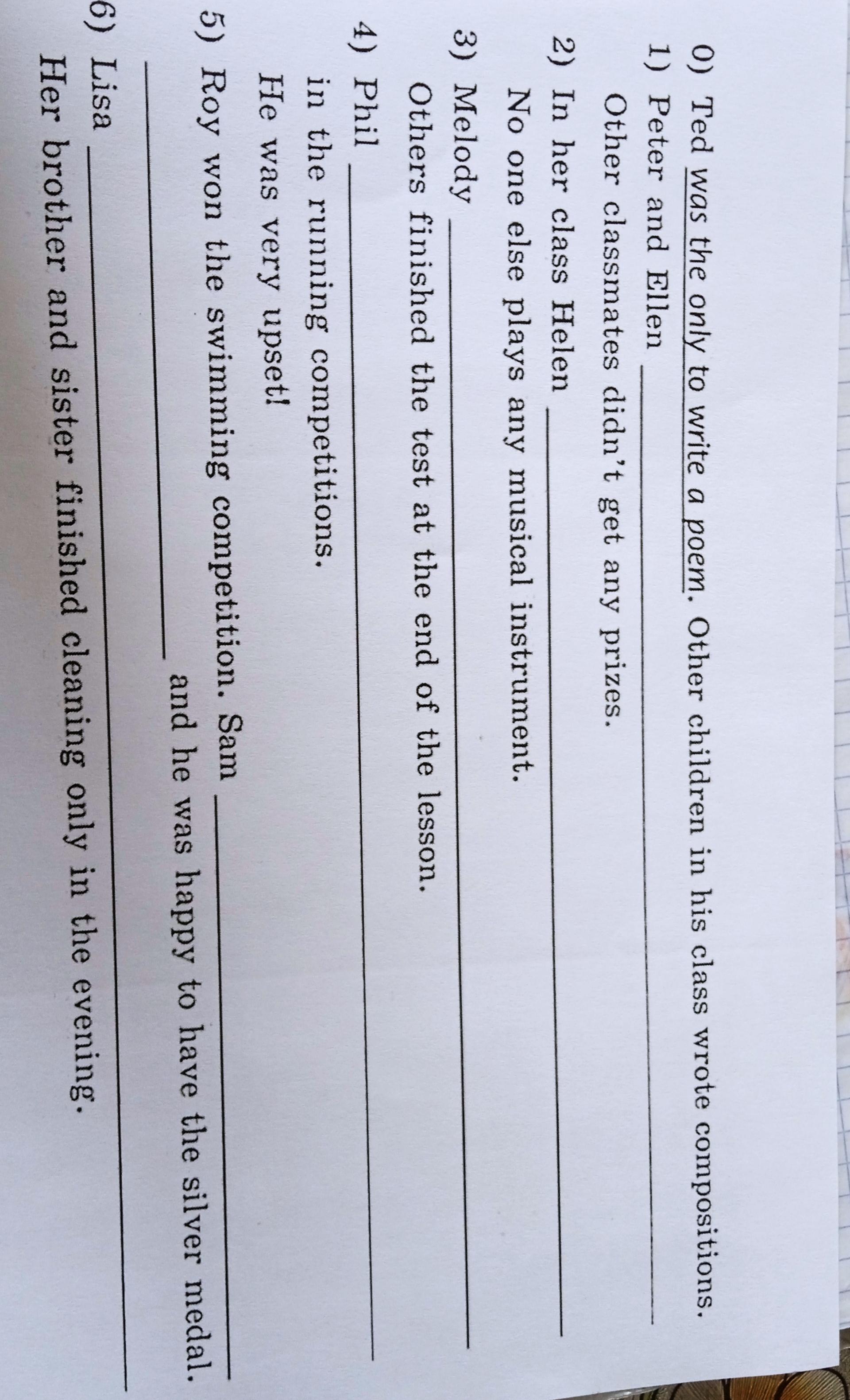 4. Phil was the only to lose in the running competitions. 5. Sam was the only to take the second place and...6. Lisa was the only to finish cleaning in the afternoon. Her brother... .