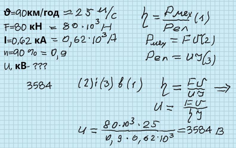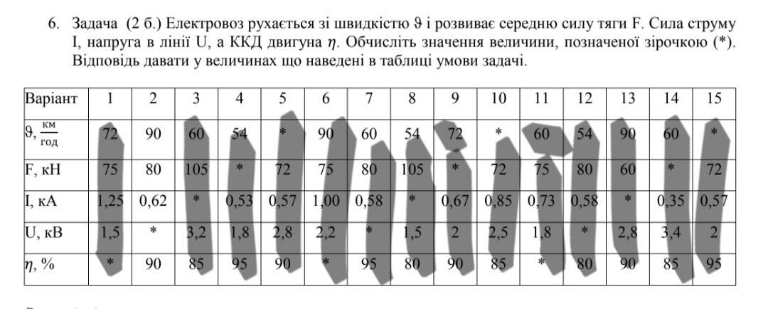 Електровоз рухається зі швидкістю ϑ і розвиває середню силу тяги F. Сила струму І, напруга в лінії U, а ККД двигуна n. Обчисліть значення величини, позначеної зірочкою (*). Відповідь давати у величинах що наведені в таблиці умови задачі.