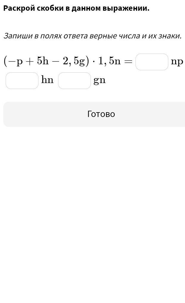 Раскрой скобки в данном выражении. Запиши в полях ответа верные числа и их знаки (-р+ 5h - 2, 5g) - 1, 5n = n hn gn