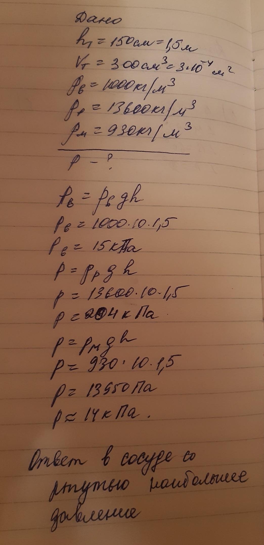 Выберете в каком сосуде тело будет оказыватся наибольшое давление на глубине 150 см расчитайте его если обьем тела равен 300см в кубе плотность воды 1000кг/м в кубе плотность ртути 13600кг/м в кубе плотнгсть масла 930 кг/м в кубе