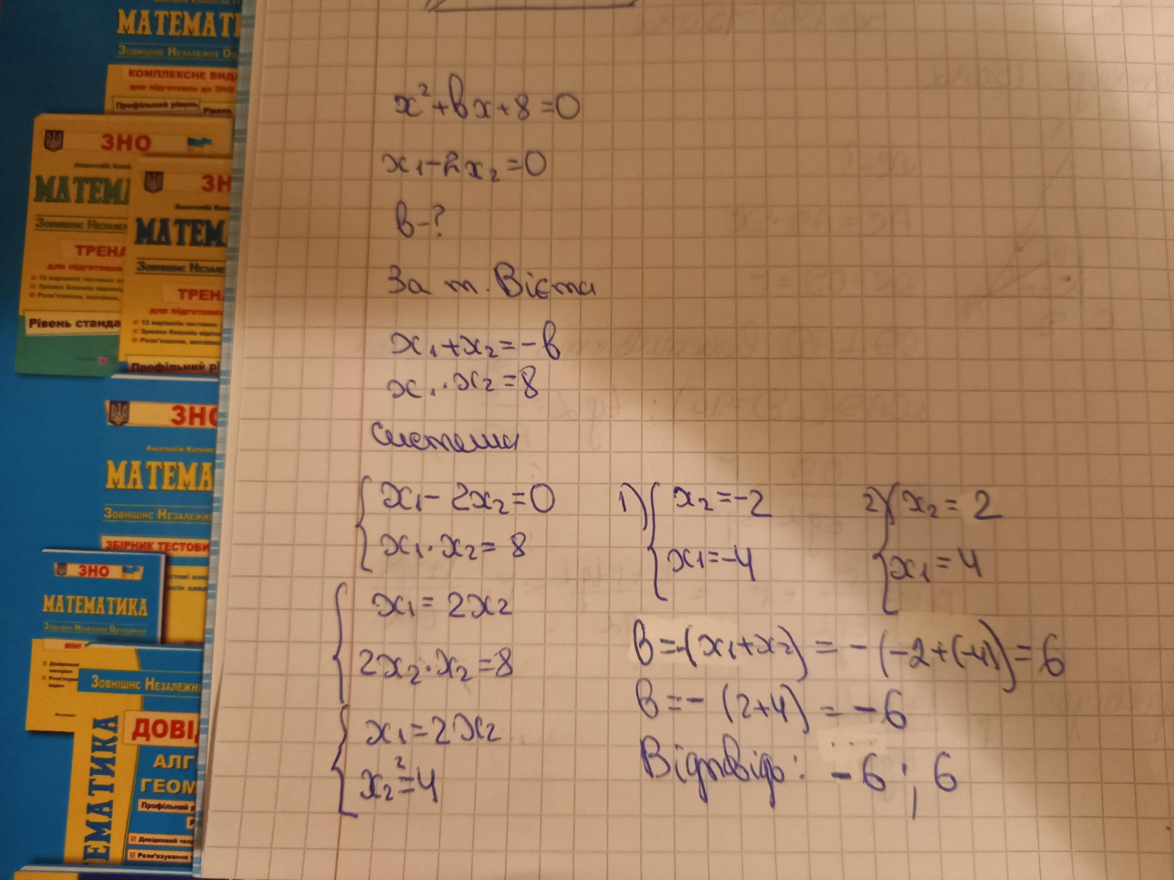 корені x1 і x2 рівняння x²+bx+8=0 задовольняють умову x1-2x2=0. Знайдіть коєфіціент b