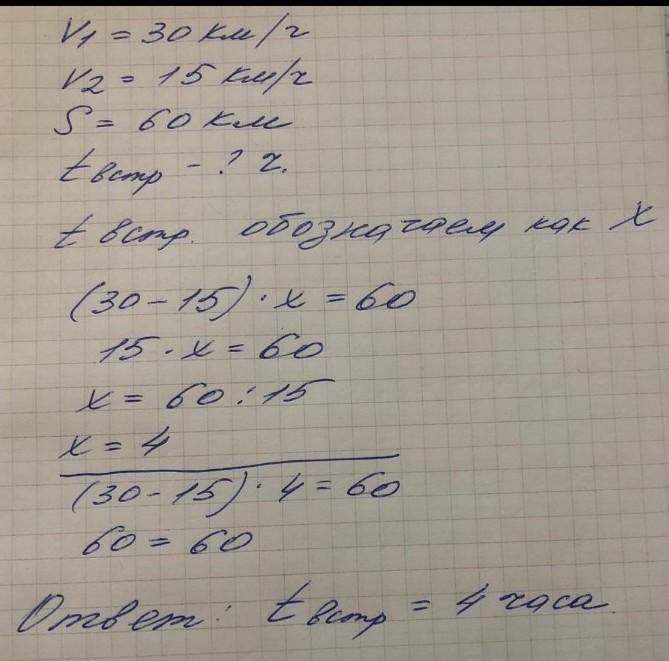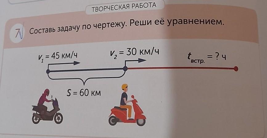составь задачу по чертежу и реши её уравнением V¹-45 км /ч v2-30 км/ч tвстр-?ч