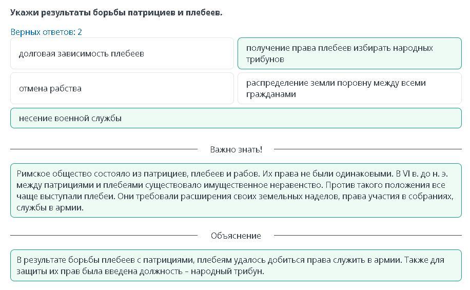 Укажи результаты борьбы патрициев и плебеев. Верных ответов: 2 долговая зависимость плебеев несение военной службы отмена рабства распределение земли поровну между всеми гражданами получение права плебеев избирать народных трибунов