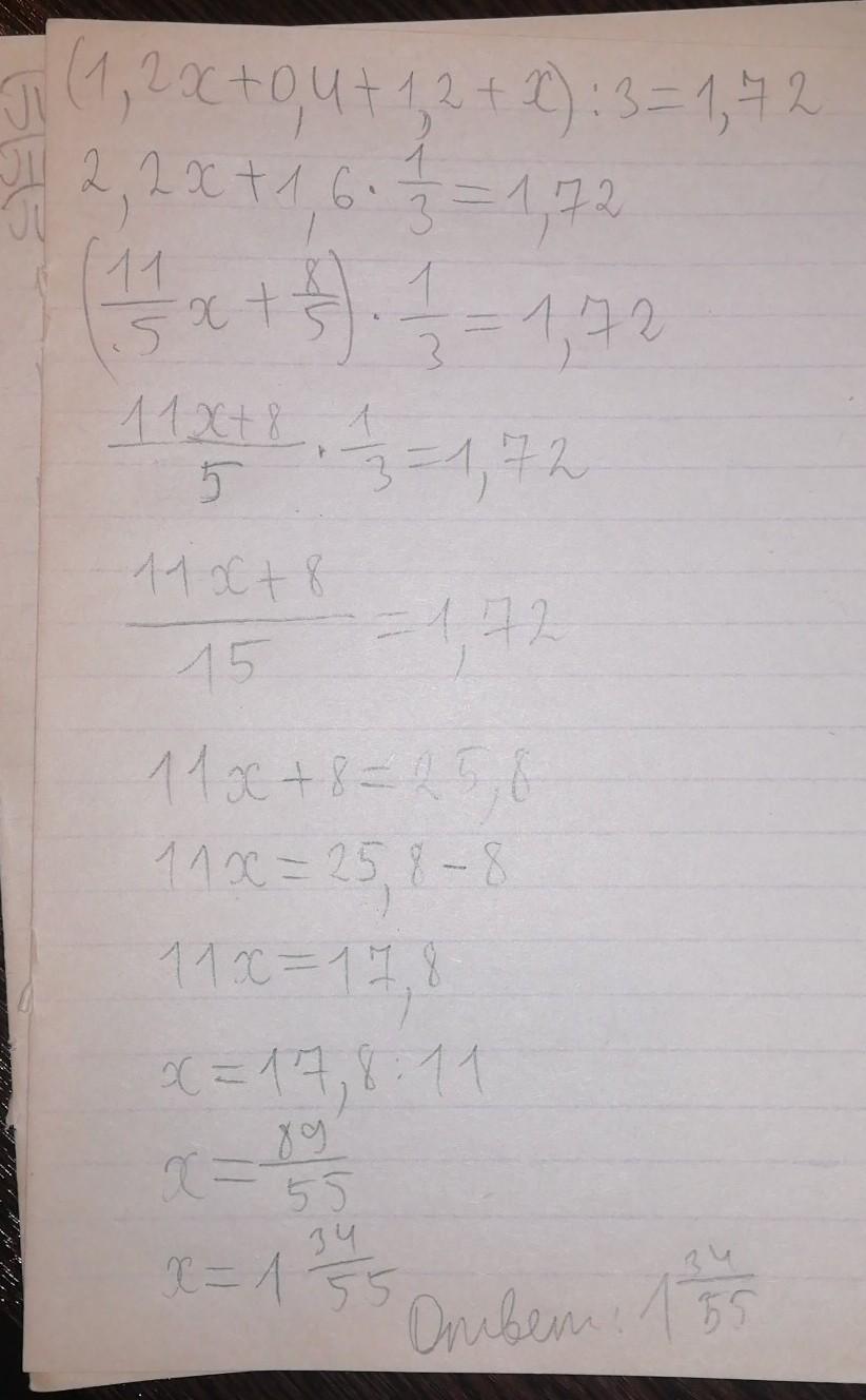 ( 1.2x + 0.4 + 1.2 + x ) : 3 = 1.72