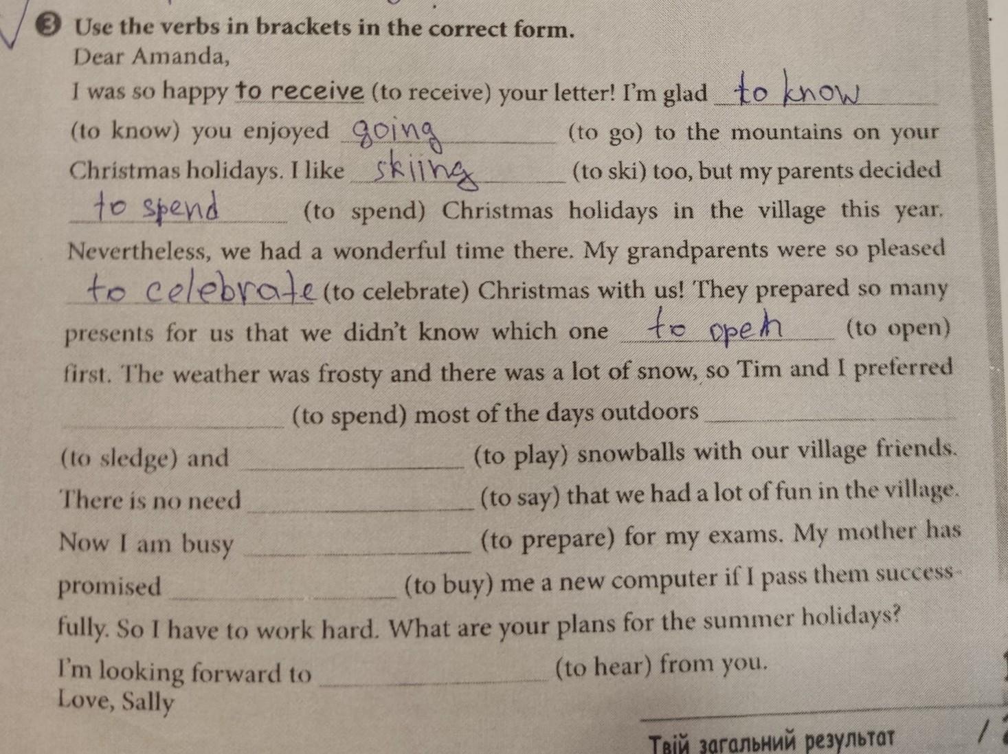 В этом упражнении все, что уже сделано, сделано правильно. Дальше там: to spend, sledging, playing, to say, preparing, to buy, hearing (да, looking forward to +V-ing - еще один нестандартный вариант того, что может идти после глагола).