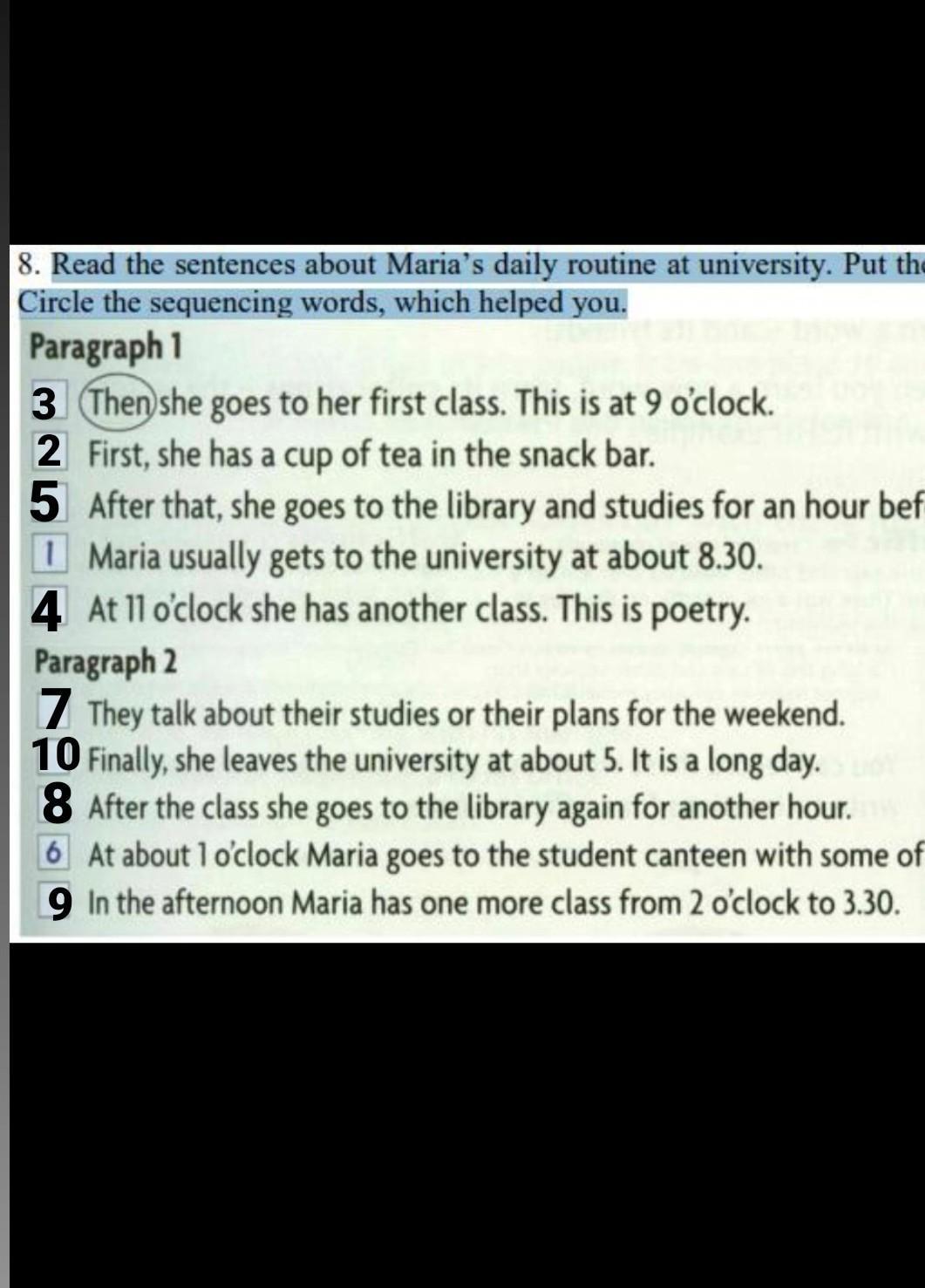 First Maria thinks of a topic.Next, she searches for information about the topic and reads all she can. She makes notes about the subject then she is reading. Finally that, she uses her notes to write a plan for the essay. After she is ready
