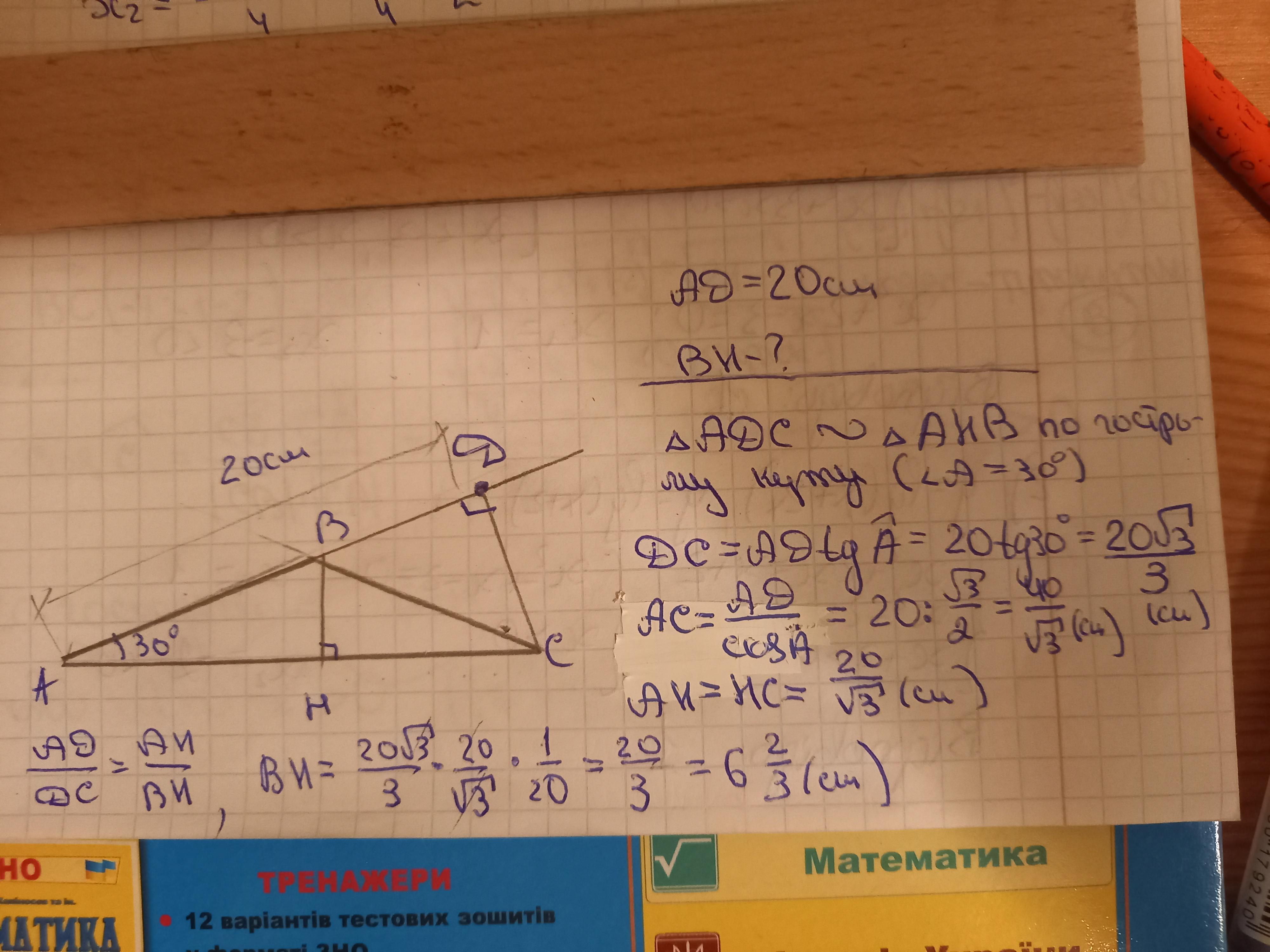 У рівнобедреному трикутнику ABC AC – основа, кут А=30, CD – висота. Знайдіть висоту, проведену з вершини B, якщо AD=20 см.