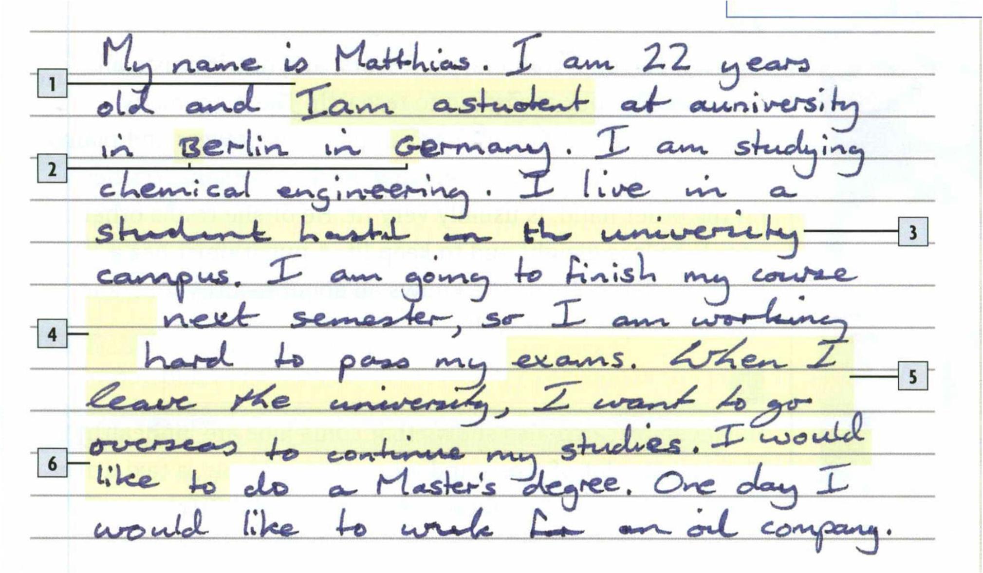 11.Look at the text about Matthias. It shows examples of six common mistakes in handwriting. Match the types of mistakes (a – f) with examples (1 – 6). Then rewrite the text correctly.