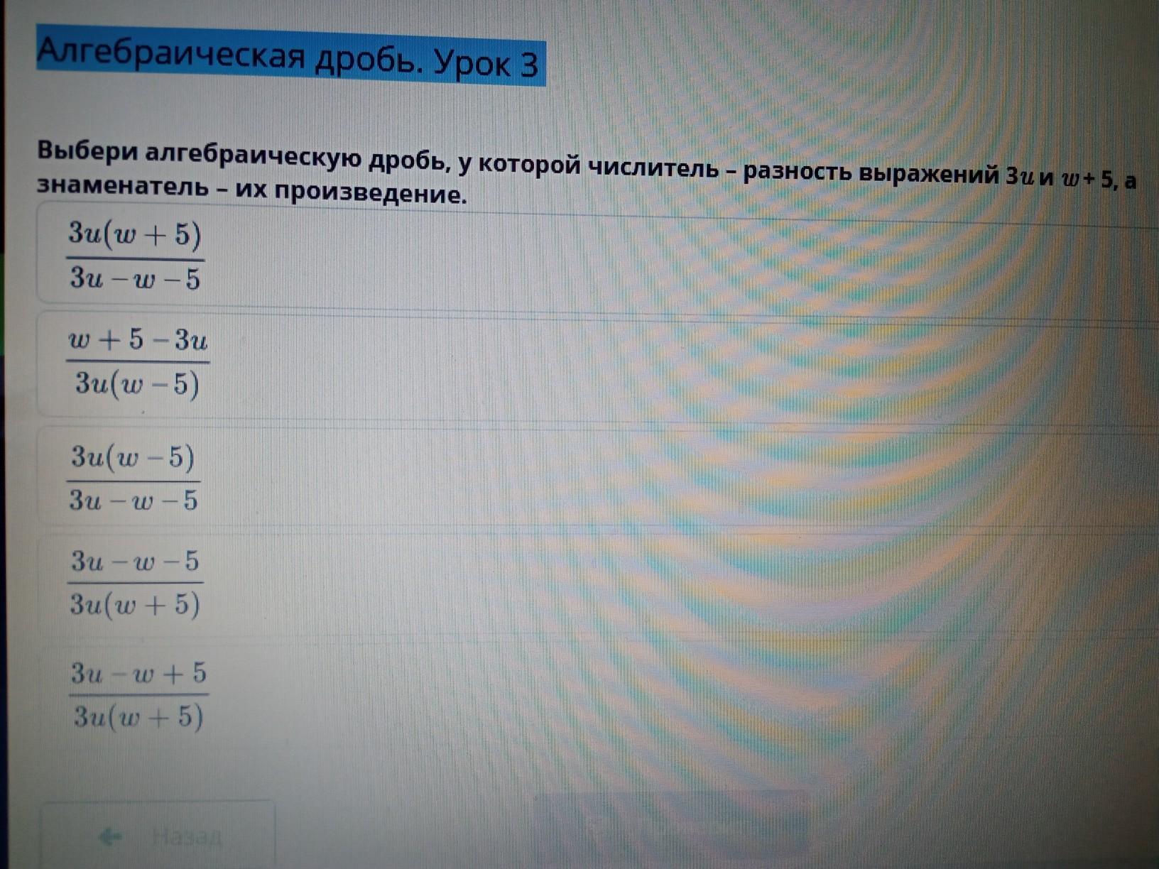 Алгебраическая дробь. Урок 3 Выбери алгебраическую дробь, у которой числитель - разность выражений Зи и ш + 5, а знаменатель - их произведение.сровно