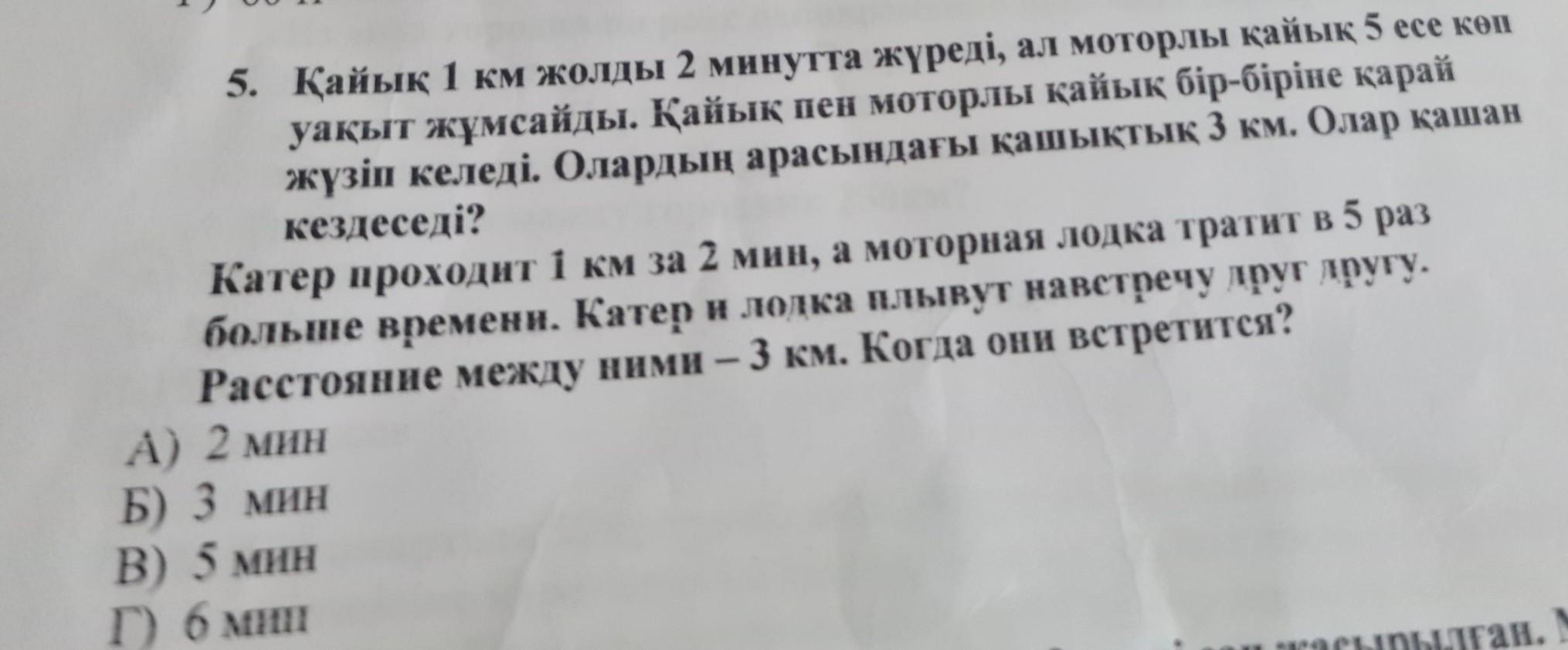 Катер проходит 1 км за 2 мин ,а моторная лодка тратит в 5 раз больше времени. Катер и лодка плывут навстречу друг другу. Расстояние между ними-3км, когда они встретится? Катер за 5мин пройдёт 2,5км, а лодка за 5мин пройдёт 0,5км, итог 2,5+0,5=3км, значит ответ В)