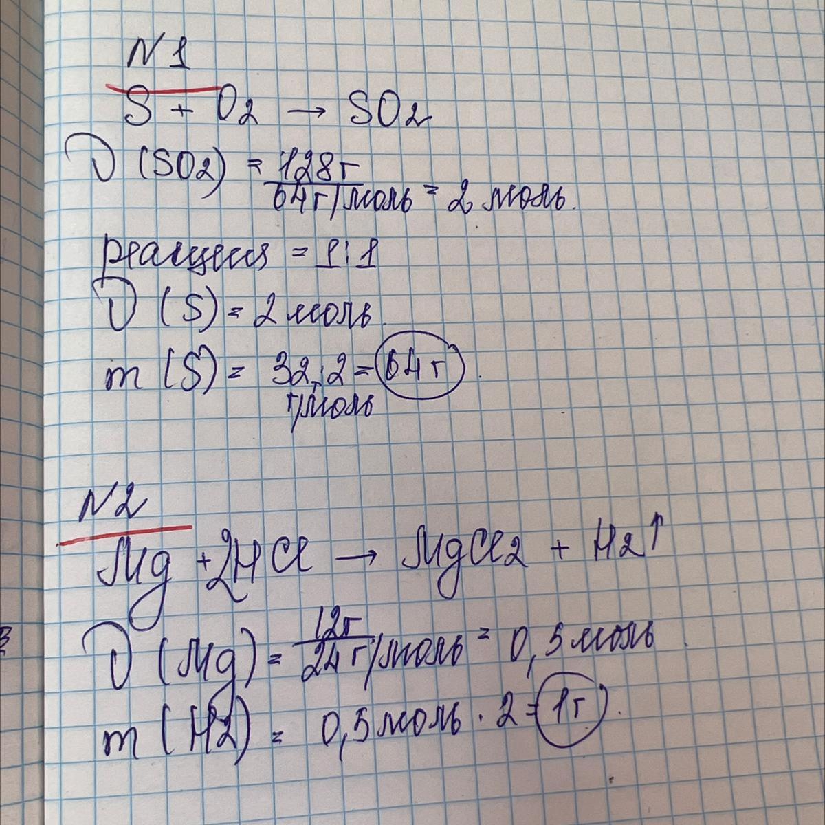 Какая масса серы затратится на получение 128 г оксида серы (IV)? В реакцию с соляной кислотой вступило 12 г магния. Рассчитайте массу образующегося водорода.