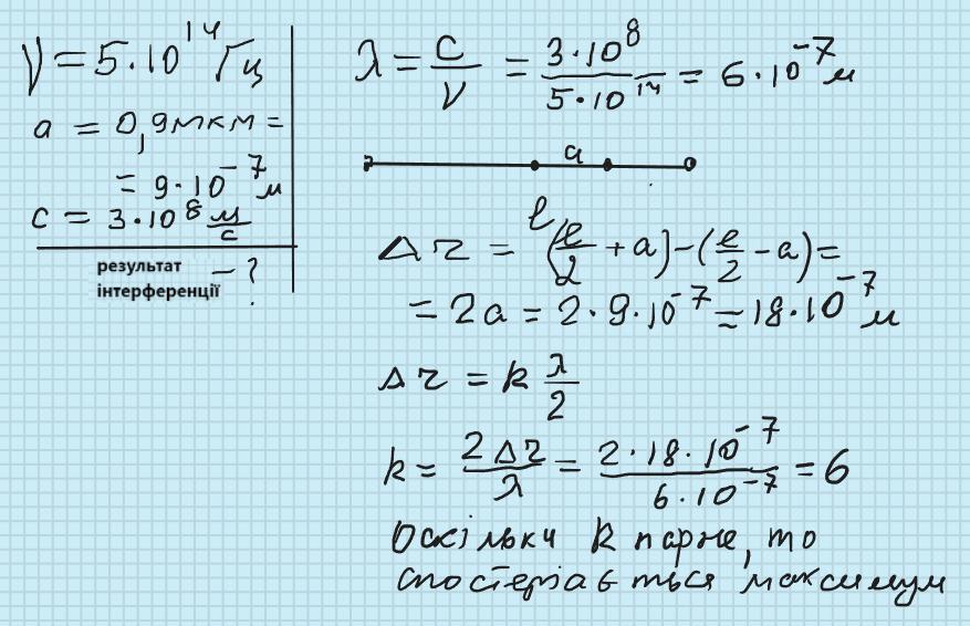 Точка А розташована на відрізку, що з’єднує два когерентні джерела світла з частотою 5·1014 Гц. Який результат інтерференції спостерігатиметься в точці А, якщо в центрі відрізка спостерігається максимум і відстань від точки А до середини відрізка дорівнює 0,9 мкм.