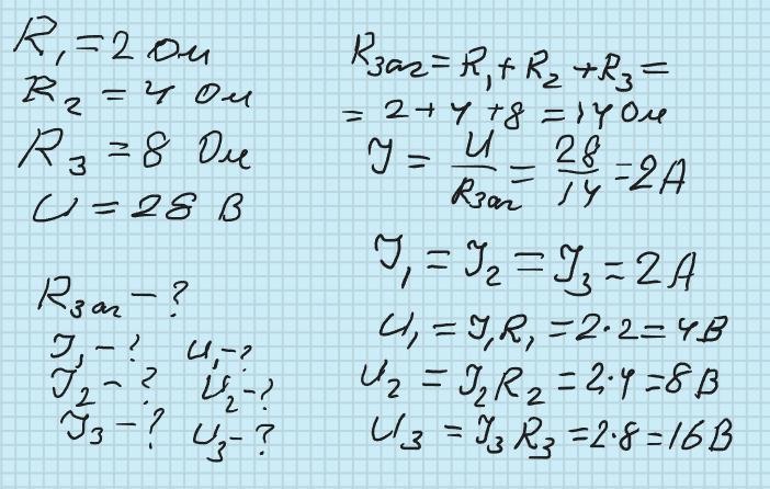 Задача. Три резистори опорами 2,4 і 8Ом з’єднани послідовно. Яким є опір цієї ділянки кола? Яка напруга на кожному резисторі і яка сила струму в цій ділянці кола, якщо напруга на розглядуваній ділянці становить 28В?