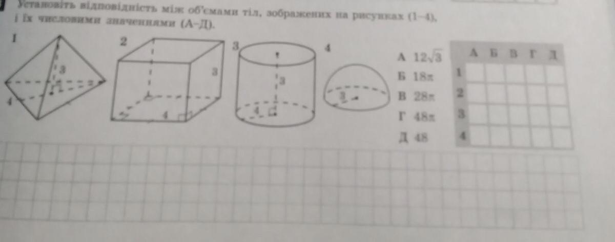 (Даю 100 балов) Установіть відповідність між об'ємами тіл зображених на рисунках (1-4) і їх числовими значеннями (а-д)