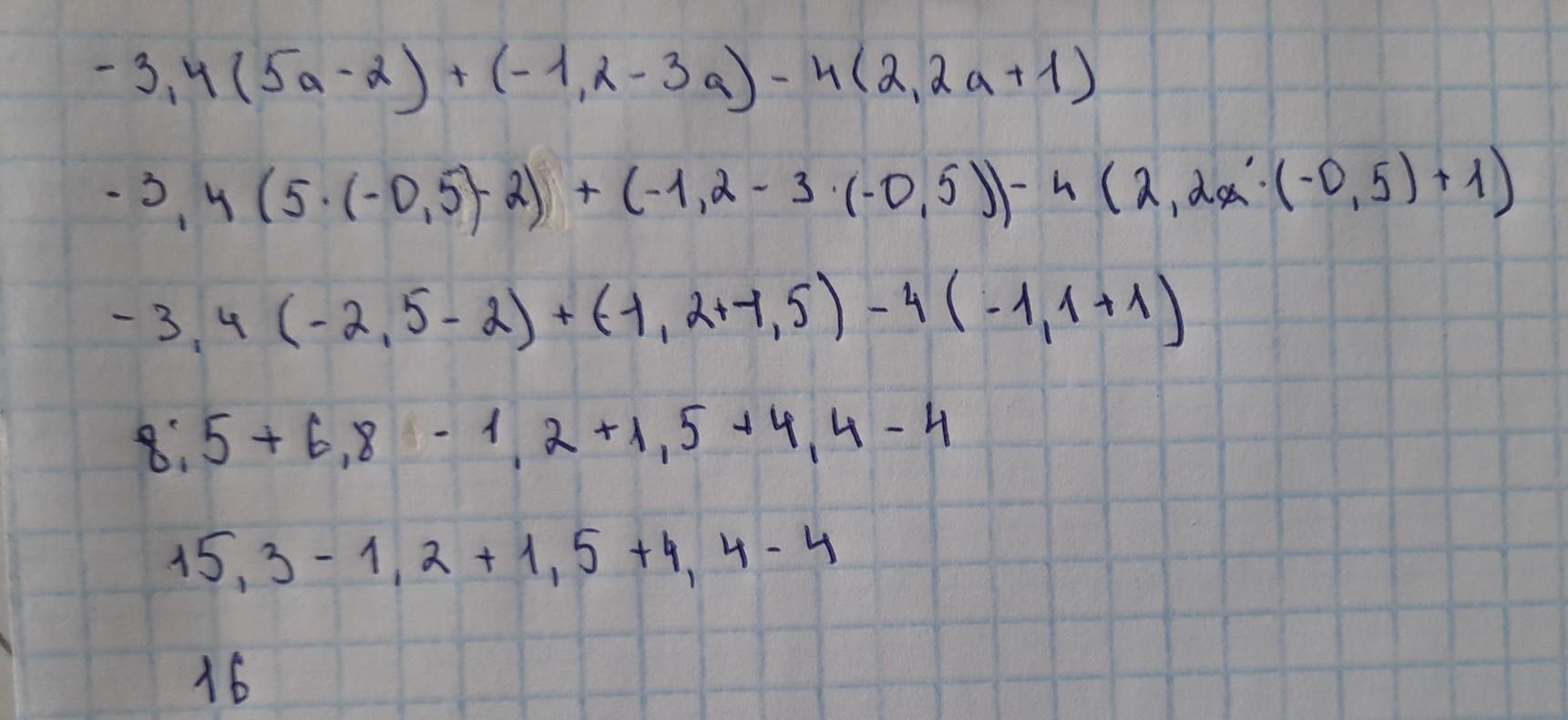 -3,4(5×(-0.5)-2)+(-1,2-3×(-0.5))-4(2,2×(-0.5)+1)=15.3-0.3-0.1=14,9