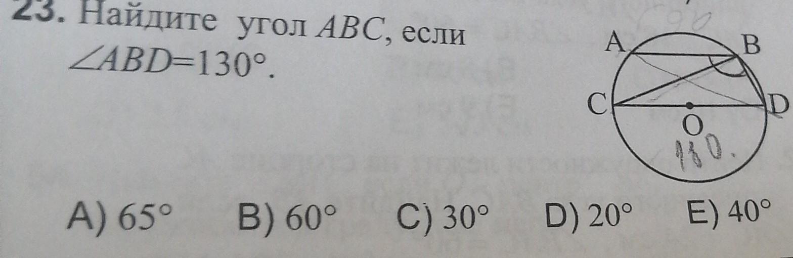 Угол CBD=90 градусов, так как опирается на полуокружность. Если АВD=130, то АВС=130-90=40 градусов