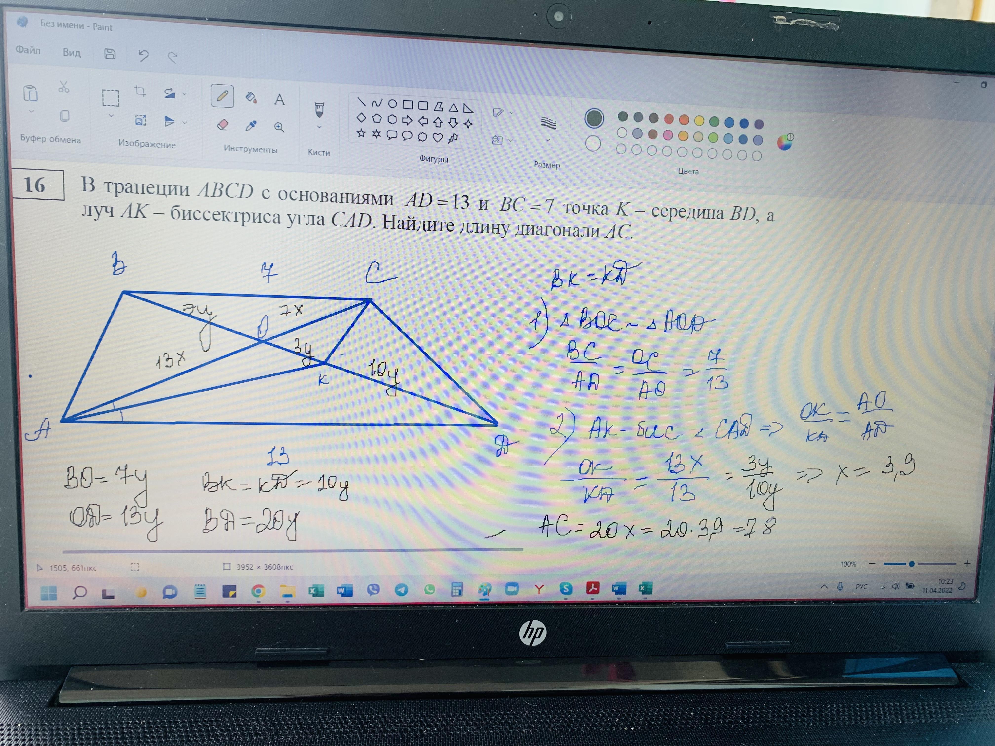 АД=13 и ВС=7 точка К середина ВД а луч АК биссектриса угла САД найти длину диагонали АС